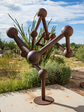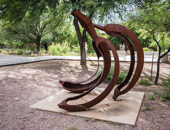 The sculpture honors the instinctive harmony of odd numbers, reflecting Grater’s cathartic artistic process, which involves an exuberant physical engagement with unyielding materials. Through heat and pressure, he shapes rigid steel into organic forms, transcending the sometimes dissonant notes of his internal life into a fluidity that embodies aesthetic delight. “Arpeggio” resonates as visual music, its wide bands curved to evoke the pleasing reverberation of five joyful chordal notes plucked in succession.